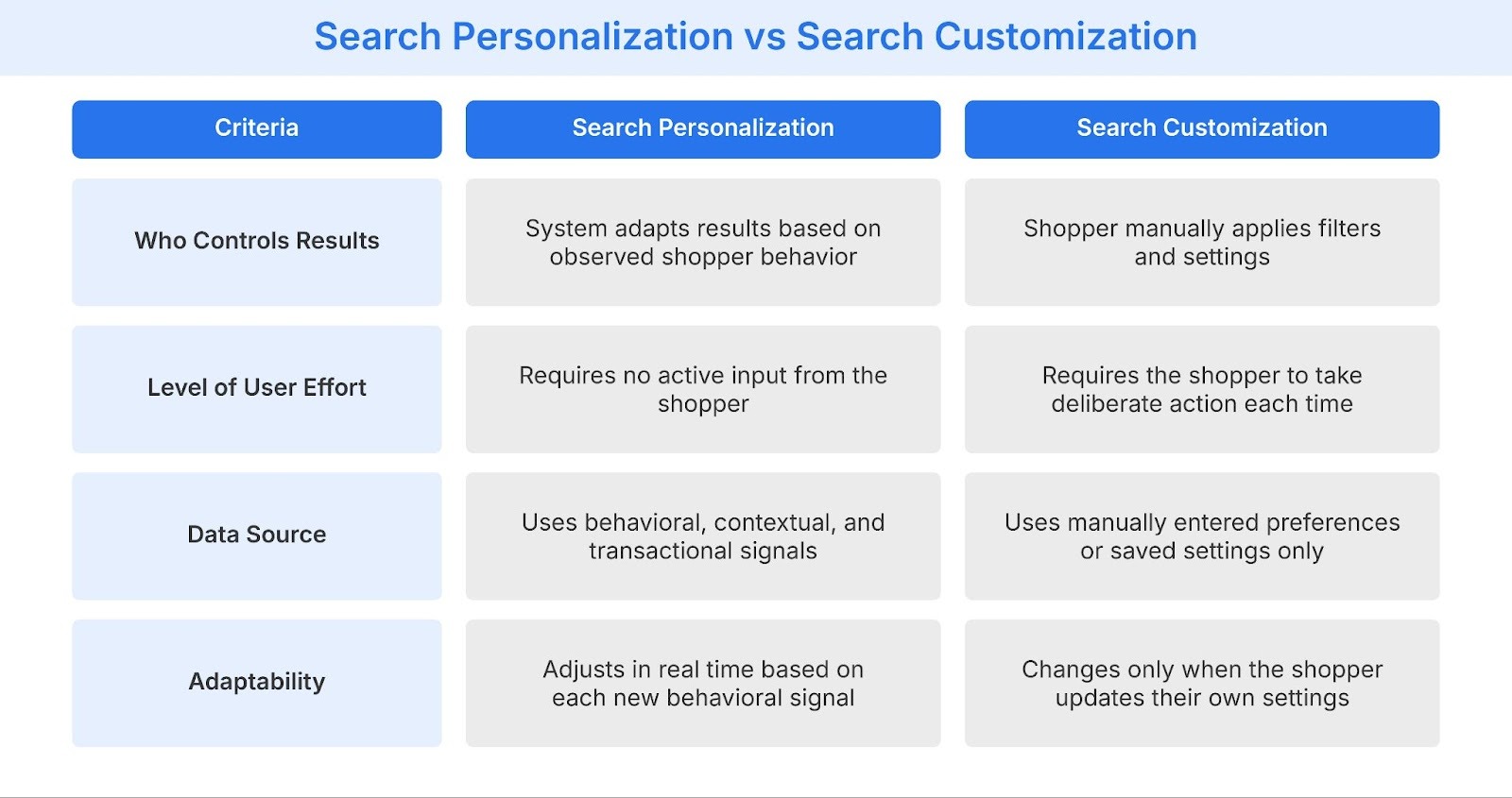 Search personalization and customization are related concepts that work in fundamentally different ways. Personalization happens automatically, with the system adapting search results based on observed shopper behavior without any input required. Customization is shopper-driven, with users manually applying filters and settings to control the results they see.
